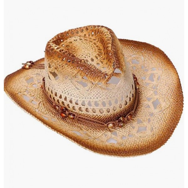 Bead_brown Men & Women's Woven Straw Cowboy Hat w/Hat Band