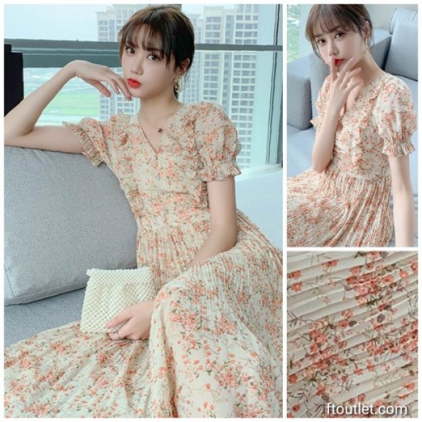 Fashion summer women's sweet floral pleated A line short sleeve chiffon dress